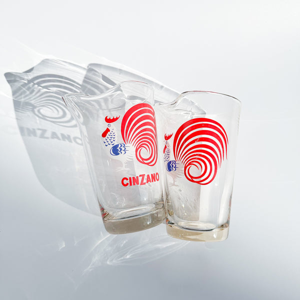 70’s Cinzano glass water jugs, in a good vintage condition (some wear off signs of the paint). Set of 2.