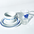 Ceramic set: restaurant coffee/tea mug with plate, starter plate and water glass (original Soju Japanese glass).