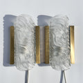 Fischer Leuchten ice glass sconces with brass mount and metallic back. Its design and structure suggest a motif of waves; the inside of the sconce has crystallized glass mass particles covering the waved ice glass that give the effect of shimmering gold particles when it’s on. Designed in the 1970’s/80’s. Wear signs on the brass parts.