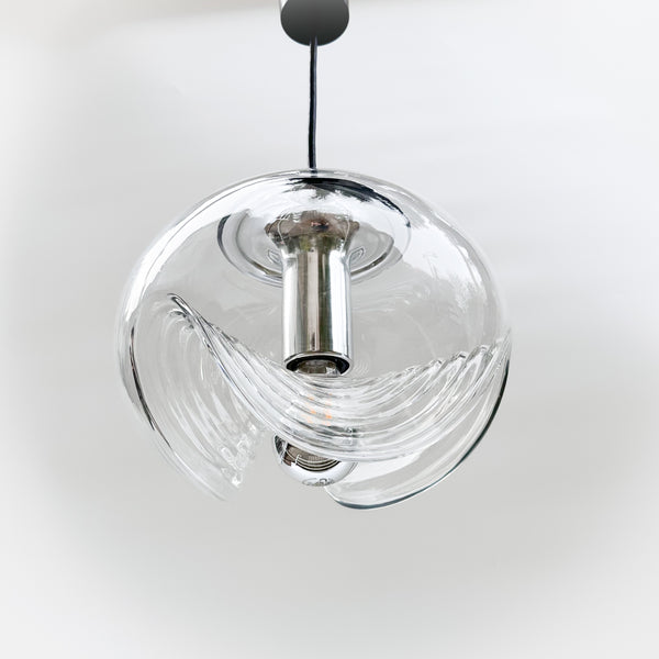 Mid-Century Modern “Wave” glass pendant lamp designed by Peill + Putzler Atelier in West Germany in the 1970’s. Hand blown, with cromed metal on top of the sphere, aluminium decorative tube inside and plastic fixture.