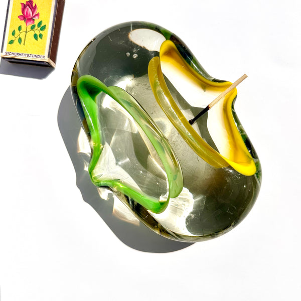 1960’s crystal ashtray. Features an organic shape with green and yellow coloured rims.